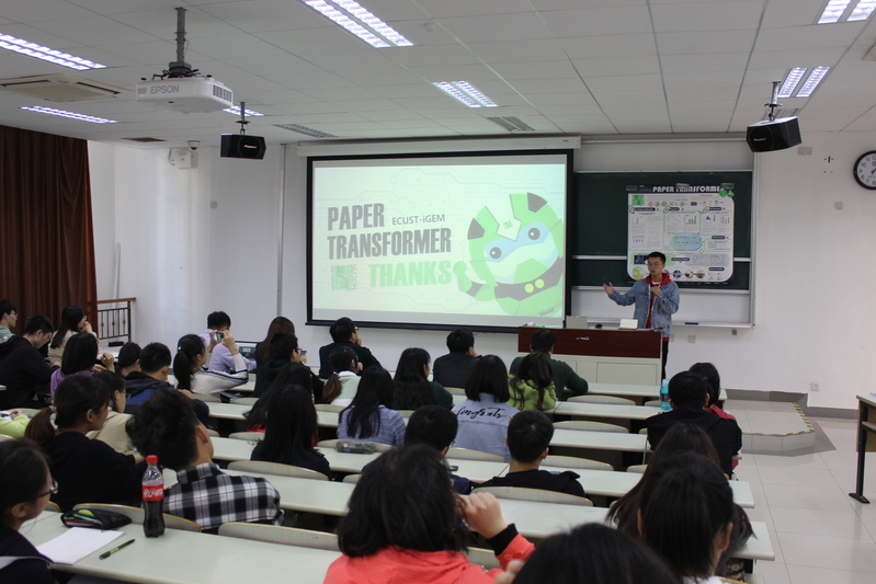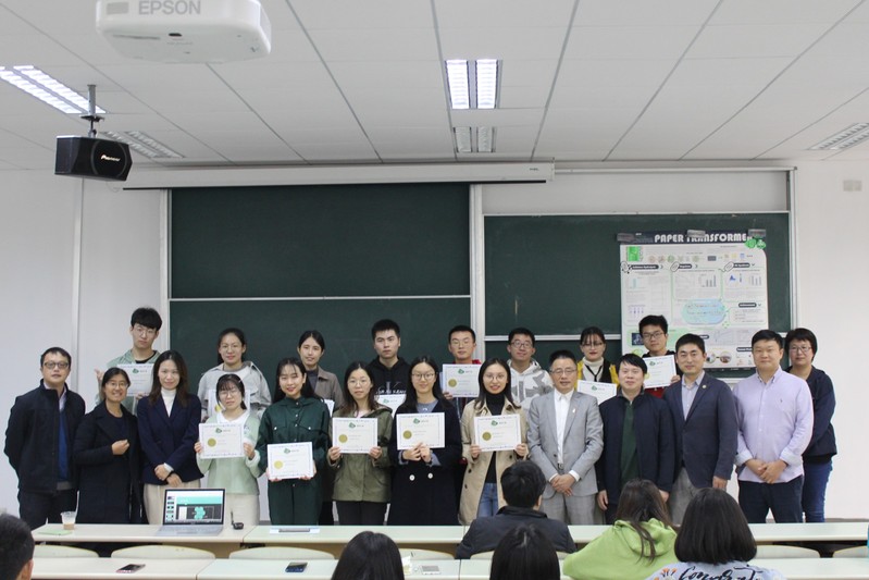 会上ECUST_China全体成员为大家重演了在美国MIT赛场上的精彩演讲,带大家认识了2019届项目主角Paper Transformer“绿胖子”吃废纸纤维素,转化成优质细菌纤维素的设计思路以及拿到最佳单项奖的3D气升式生物反应器的中试设备,大家亲历比赛现场,演讲结束后同学们还回答了老师们用英文提出的问题,与团队成员进行交流。队伍队长缪宗杰为大家介绍了团队在备赛过程中的各种努力,克服困难并最终获奖的全过程。