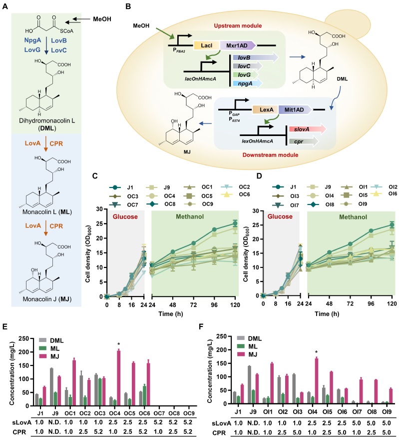 在此基础上,作者选用降血脂上市药物中间体莫纳可林J作为报告化合物,进一步检验了人工转录器件库cTRDLiTRDL在复杂药物分子合成途径重构和调控中的应用成效。以甲醇为底物,选择iTRDL来源的器件适配平衡上游的聚酮合成模块,通过正交设计成功实现中间产物二氢莫纳克林L的高效合成,产量和产率达到相同培养条件和相同基因剂量下PAOX1表达模式的5.5倍和9.3倍。进一步,选择cTRDLiTRDL来源的器件分别适配平衡下游氧化过程模块,通过全因子设计对整个途径的6种关键酶进行优化适配和非交互调控,最终实现了模块内和模块间的优化平衡,大幅度提升了目标产物莫纳可林J的合成能力,产量和产率达到相同培养条件和相同基因剂量下PAOX1表达模式3.0倍和5.0倍,且优于PAOX1表达模式的多拷贝基因剂量优筛菌株的产物合成能力,展现了作者所构建的人工器件库的精细调控、灵活可控、高效表达的特性。