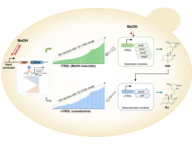 该研究中,作者在前期设计转录增益装置的基础上(Science Advances, 2022, 8:eabl5166),进一步分析毕赤酵母转录调控机制并重构转录调控遗传线路,对不同来源和功能的DNA结合蛋白、结合序列、转录因子激活域等特定功能元件进行组合设计,构建了一套输出强度呈连续变化的组成型人工转录器件库cTRDL,库容量达到126个,强度为商业化毕赤酵母PAOX116%~520%,整体差异倍数达到32.5倍。在此基础上,通过筛选合适强度范围的甲醇诱导型启动子作为输入启动子,适配人工转录调控核心组件,进一步构建了一套输出强度呈连续变化的甲醇诱导型人工转录器件库iTRDL,库容量达到162个,强度为PAOX130%~500%,整体差异倍数达到16.7倍。理论上,两套具有不同调控模式、输出强度连续变化、强度跨度大的人工转录器件库,可为毕赤酵母中重组蛋白表达和复杂小分子产物合成提供更多可选的工具和更为灵活的调控模式。